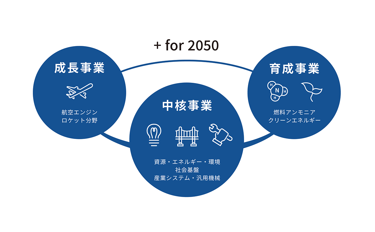 現在、IHIグループでは成長事業・育成事業・中核事業の3つに事業を区分して取り組んでいます。中核事業は資源・エネルギー・環境分野、社会基盤分野、産業システム・汎用機械分野といった多岐にわたる、文字通り現在のIHIの中心となる事業です。対して成長事業は主に航空エンジンとロケット分野です。長いロードマップを描き、たとえばジェットエンジンの軽量化や、航空燃料の脱CO2などの研究を進めています。