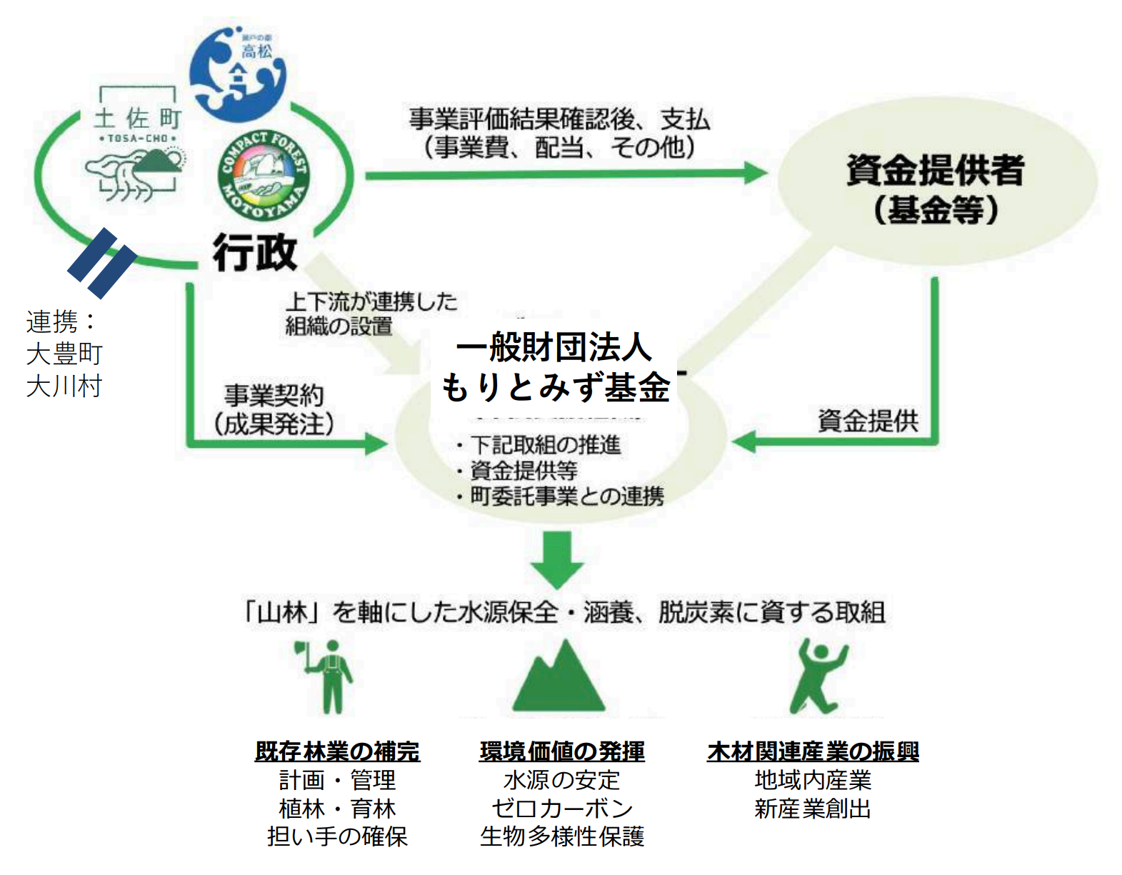 2022年には、土佐町と本山町、高松市の流域連携で持続可能な水源の保全・涵養を実現する中間支援組織「グリーンアクセラレーター」構築事業が、内閣府の広域連携SDGsモデル事業に選定。2024年1月、3市町の共同出資による「もりとみず基金」が設立され、2025年4月には2町村が加わりました。