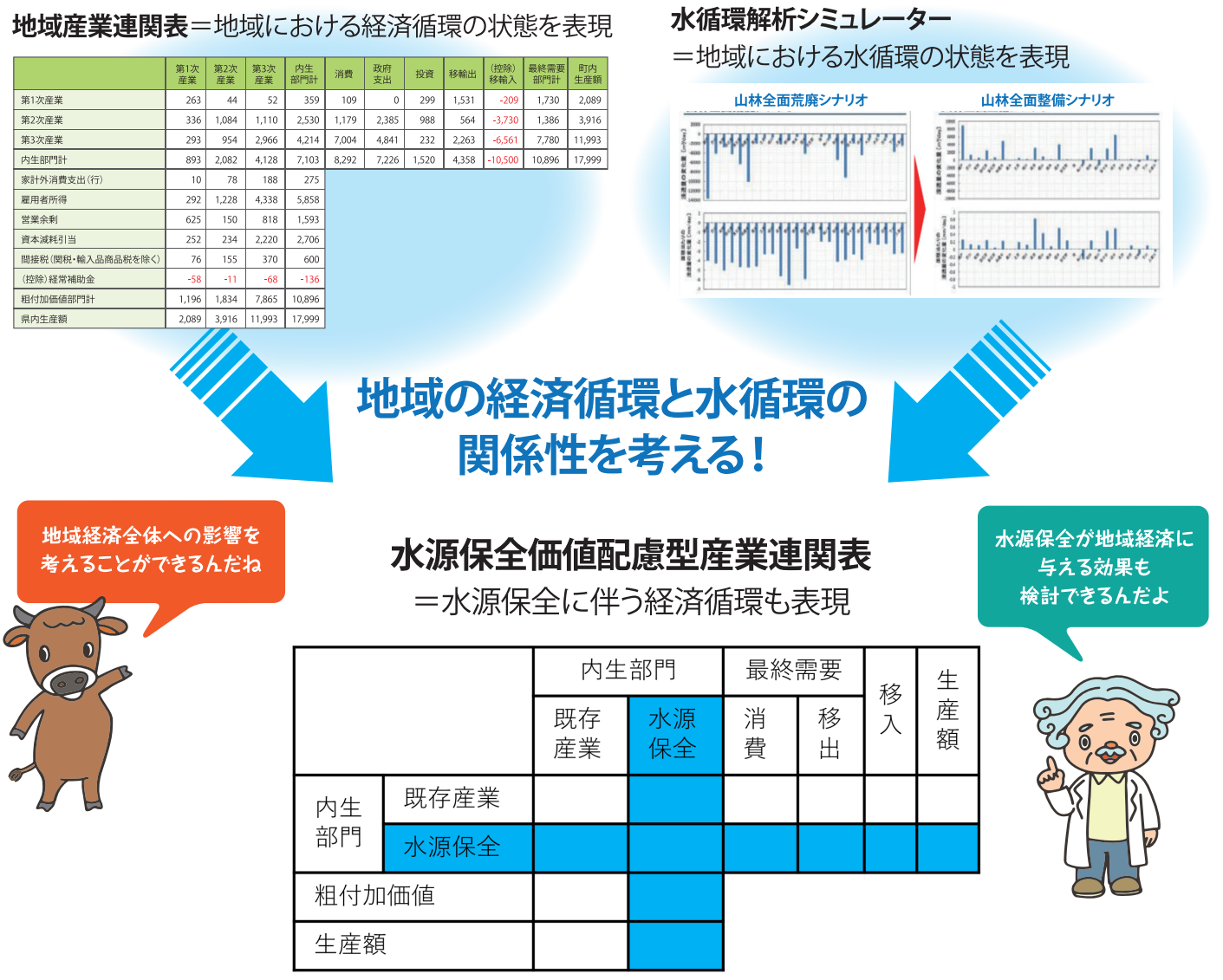 さらに高知大学と共同で、林業が地域の産業とどのようにつながっているのかという地域産業連関分析を行い、これを水循環シミュレーションの結果と合わせ、水源保全が地域経済に与える効果を見える化。森に手を入れないまま水が足りなくなった時にどの産業に影響が波及して、その損失がいくらなのか。山林整備を行い早明浦ダムへの水流入量が確保されていた場合、その水量に対応する経済効果はどれくらいか。山林の整備が都市部にとってもメリットがあることを数値で示しました。