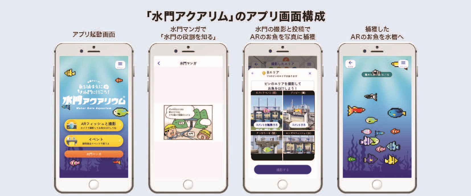 初めにアプリケーションの仕組みをご紹介します。ユーザーが地域にある水門を訪れてスマートフォンで撮影し、気になったことなどコメントを付けて投稿すると、AR(拡張現実)の魚をゲットでき、アプリ内の水槽にストックされます。水門ごとに異なる魚が用意されているので、いくつもの水門を回って写真を撮ることで、水槽には色とりどりの魚が泳ぐようになります。